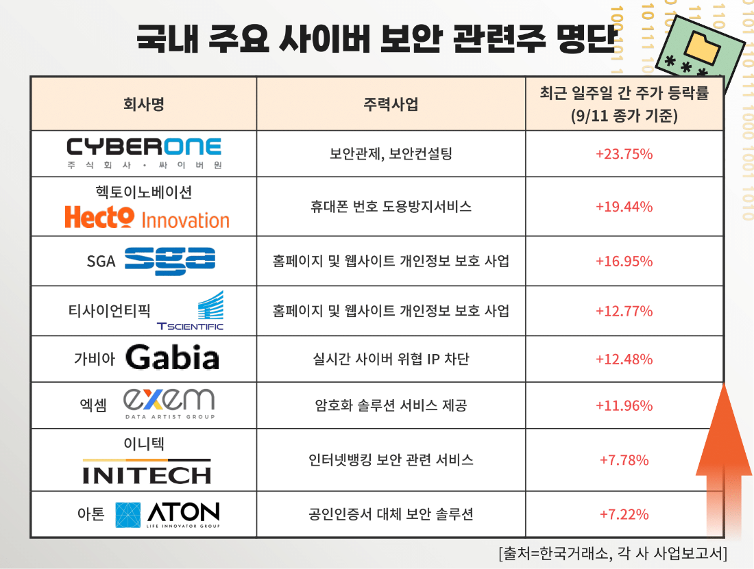 사이버보안 역량 강화가 재계를 넘어 사회 전체의 화두로 급부상하자 증권가에선 국내 증시에 상장된 보안 기업들의 수혜 가능성을 염두에 둔 분주한 움직임이 생겨나고 있다. 정부의 사이버보안 역량 강화 정책과 기업들의 자발적 움직임까지 맞물리면서 관련 기업들의 수주 확대와 매출 상승이 일어날 것이라는 판단이다. 국내 증시에 상장된 주요 보안 기업으로는 ▲싸이버원 ▲헥토이노베이션 ▲SGA ▲티사이언티픽 ▲가비아 ▲엑셈 ▲이니텍 ▲아톤 등이 있다.