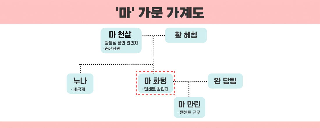 텐센트의 창업주는 마화텅 CEO다. 그는 텐센트 설립 이후 지금까지 경영을 진두지휘하고 있다. 재산 규모는 566억달러(약 83조원)에 달하는 것으로 추산됐다. 광둥성 출신인 마화텅 CEO는 공산당원 부친을 둔 ‘금수저’로 알려졌다. 그의 부친 마천술(马陳術)은 광둥성 선전의 항만 관리자로 재직하면서 중국 내 무역 분야에서 상당한 입지를 쌓았다. 마화텅이 텐센트를 창립할 당시 마천술의 네트워크가 상당한 보탬이 됐던 것으로 전해진다. 또한 그는 아내인 왕당팅(王丹婷) 사이에서 딸인 마만린을 두고 있다. 다만 그의 가족에 대한 정보는 철저히 베일에 가려져 있다.