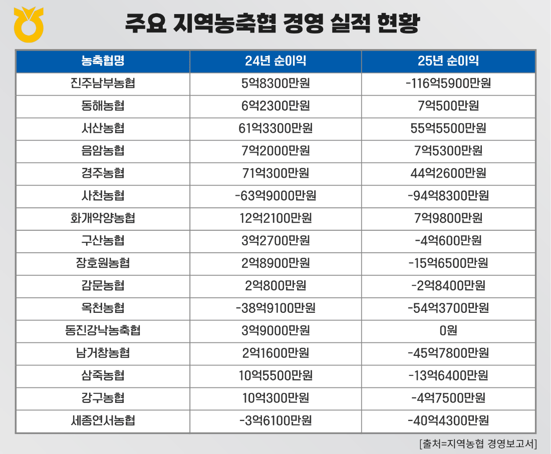 ‘적자’ 조합들도 대거 등장했다. 경상남도 진주시 진주남부농협은 지난해 116억5900만원의 당기순손실을 기록하며 전년(5억8300만원 흑자) 대비 수익이 120억원 넘게 급감했다. 경기도 이천시 장호원농협과 전북특별자치도 전주원예농협도 지난해 각각 15억6500만원, 15억4600만원의 순손실을 내며 적자로 돌아섰다. 특히 전주원예농협은 경영실태평가 등급이 1년 만에 1등급에서 3등급으로 두 계단이나 하락했다. 충청남도 금산군 금산농협 역시 순이익이 직전해(2억200만원)에 비해 30억원 이상 줄면서 31억7000만원의 순손실로 돌아섰다.