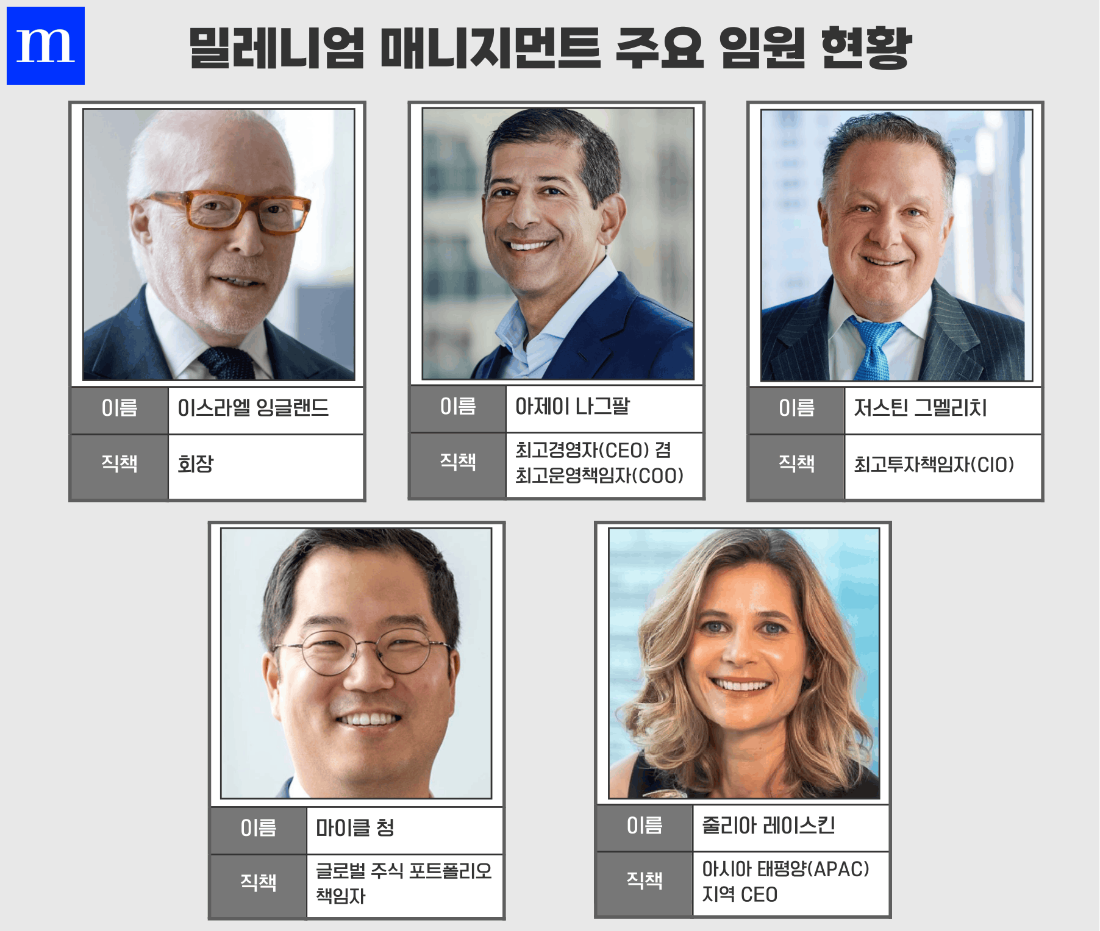 잉글랜더 회장과 함께 밀레니엄을 이끄는 아제이 나그팔 사장 겸 최고운영책임자(COO) 역시 30년 이상 투자분야에 몸담아온 베테랑이다. 과거 바클레이즈, 리먼브라더스, JP모건 등 월가의 유명 자산운용사를 두루 거친 그는 2013년 밀레니엄에 합류한 후 지금은 밀레니엄의 전략 및 글로벌 사업 전반을 총괄하고 있다. 그는 브라운 대학교를 졸업한 후 하버드대학교 케네디 행정대학원에서 공공정책학 석사 학위를 취득했다. 지난 2023년 밀레니엄에 합류한 저스틴 그멜리치 공동 최고투자책임자(CIO)는 골드만삭스, 킹스트리트 등을 거친 이력을 지녔다. 특히 그는 골드만삭스에선 무려 20년이나 몸담으며 상무이사와 파트너, 채권·외환·상품(FICC) 부문 글로벌 최고운영책임자(COO), 신용 거래 부문 글로벌 총괄 등의 요직을 거쳤다. 과거 그는 빌라노바대 재무학 학사, 서던캘리포니아대 회계학 석사, 컬럼비아대 재무학 MBA 과정 등을 거쳤다.