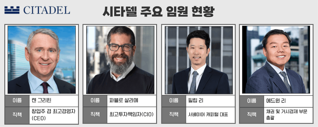시타델의 창업주인 켄 그리핀(Ken Griffin) 회장은 월가의 전설적인 투자자로 유명한 인물이다. 하버드 대학교 재학 시절 기숙사 지붕에 대형 안테나를 직접 설치해 온라인 채권 거래를 시도했던 일화는 익히 유명한 이야기다. 1990년 460만달러의 자본금으로 시타델을 설립한 그는 수차례의 금융 위기 속에서도 탁월한 리스크 관리 능력을 발휘하며 회사를 세계 정상급 헤지펀드 반열에 올렸다. 현재 그는 미국 정·재계에 독보적인 영향력을 행사하는 거물로 발돋움한 상태다.