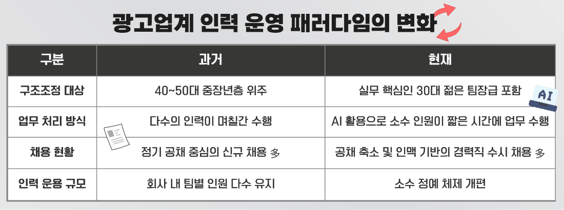 인공지능(AI) 기술이 광고·홍보 업무 전반에 깊숙이 침투하면서 국내 광고업계의 인력 구조 재편이 가속화되고 있다. 최근에는 탄탄한 매출 기반을 갖춘 대기업 계열 광고대행사(인하우스) 30대 젊은 팀장급 인력까지 구조조정 대상에 포함되는 등 고용 불안이 현실화되는 모습이다. 관련업계 안팎에선 AI가 단순한 보조 도구를 넘어 기획과 실행의 핵심 도구(tool)로 부상함에 따라 업계 전반의 인력 감축 바람은 앞으로 더욱 거세질 것이라는 전망이 우세하다.