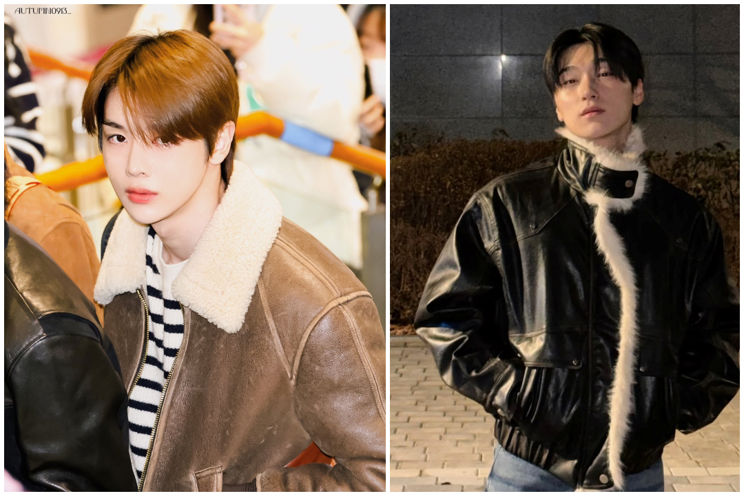 아이돌 그룹 라이즈의 성찬은 브라운 무스탕과 아이보리 톤 퍼, 그리고 스트라이프 니트의 조화를 통해 부드러운 겨울 스타일을 선보였다. 목을 감싸는 짧은 퍼 디테일과 각이 잡힌 가죽 스티치는 세련된 분위기를 강조하며, 가죽 질감과 미니멀한 니트의 조합이 단정하면서도 트렌디한 이미지를 완성했다.