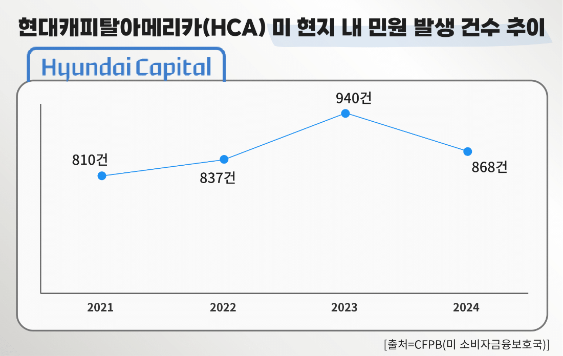 현대캐피탈의 글로벌 사업에 경고등이 커졌다. 최근 현대캐피탈의 최대 해외 법인 중 절대적인 비중을 차지하고 있는 현대캐피탈 미국 법인(이하 현대캐피탈아메리카)의 악재가 심화되고 있어서다. 내부적으로 경영 실적이 하락세를 거듭하는 가운데 소비자 신뢰와 직결된 민원 건수도 갈수록 늘고 있는 것으로 나타났다.