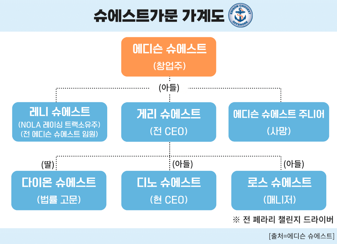 게리 슈에스트의 형제인 레니 슈에스트(Laney Chouest)는 한때 경영에 참여했으나 현재는 노라 레이싱 파크 소유주로 활동하며 모터스포츠 사업에 전념하고 있다. 막내인 에디슨 슈에스트 주니어(Edison Chouest Jr)는 2022년 세상을 떠났다.