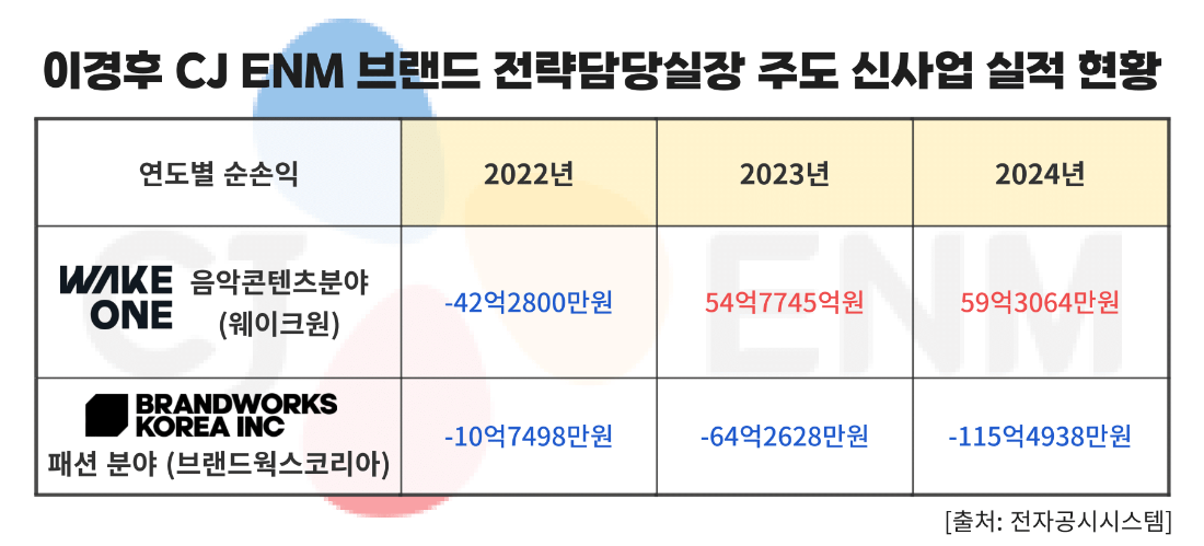 과거부터 CJ ENM이 영위해온 음악 콘텐츠 분야와 달리 이 실장이 시작부터 사업 전체를 진두지휘한 패션 분야는 갈수록 적자폭이 확대되고 있다. 지난 2021년 이 실장은 CJ ENM의 역접사업으로 패션사업을 지목하며 패션 자회사 브랜드웍스코리아를 통해 미국의 패션 브랜드인 ‘브룩스 브라더스’(정장)와 ‘락포트’(신발)의 국내 판권을 확보해 리브랜딩에 나섰다. 그러나 랜드웍스코리아는 지난 2022년 약 15억원의 순손실을 낸 데 이어 ▲2023년(-64억2628만원) ▲2024년(-115억4938만원) 등 적자 규모가 눈덩이처럼 커지고 있다.