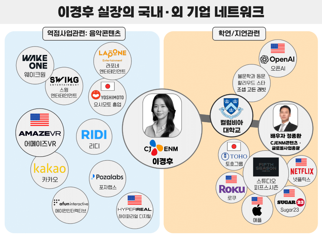 당시 정 총괄은 CJ제일제당이 진행한 미국 냉동식품 회사 슈완스컴퍼니의 인수 과정에서 핵심 역할을 맡은 것으로 알려졌다. 2021년 ㈜CJ를 떠나 CJ ENM 브랜드전략실로 자리를 옮긴 후 지난해 2월 콘텐츠·글로벌사업 총괄에 임명됐다. 정 총괄과 이 실장은 컬럼비아대학 동문으로 미국 유학시절 인연을 맺은 것으로 알려졌다. 정 총괄은 최근 CJ ENM 글로벌 콘텐츠 및 M&A 사업에 주력하고 있다. 콘텐트·글로벌사업 부문은 예능 및 콘텐츠 해외 유통 등을 아우르는 CJ ENM의 중장기 성장 전략의 중심축으로 꼽힌다. 특히 CJ ENM이 글로벌 OTT 시장 및 IP 제작사들과의 접점을 늘려가고 있는 가운데 정 총괄이 가진 국제 금융 및 M&A 네트워크가 상당한 역할을 하고 있는 것으로 전해진다.