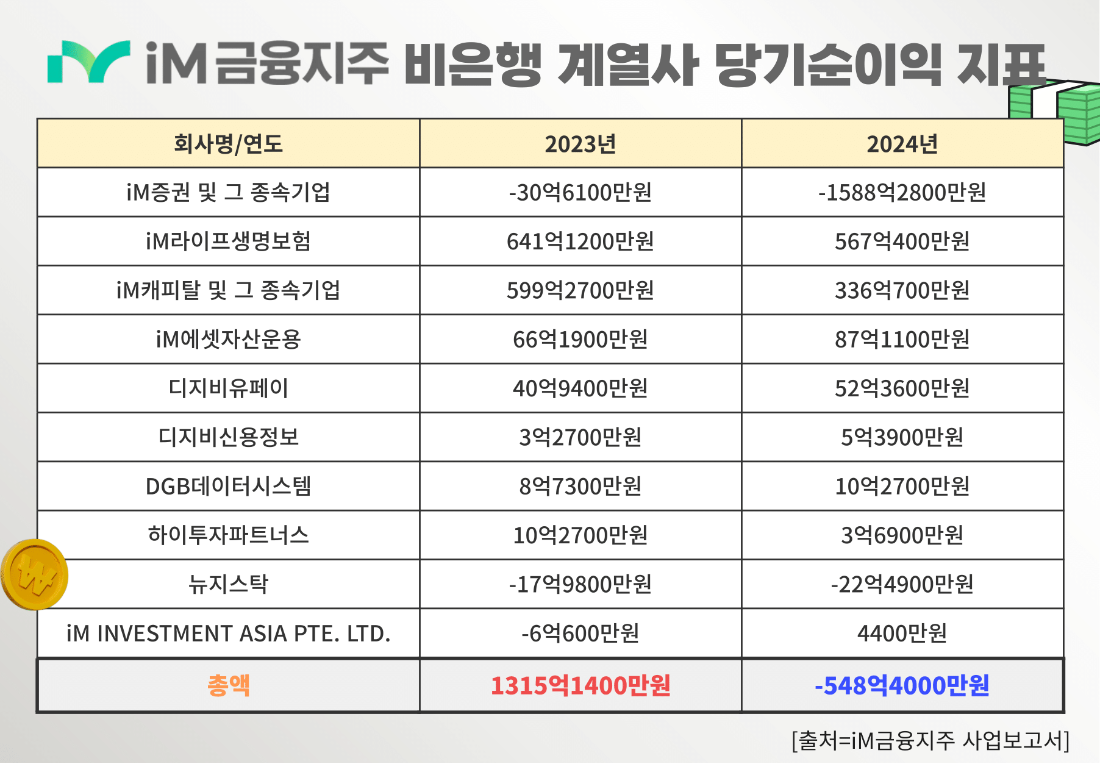 비은행 계열사별 실적을 살펴 보면, iM증권(옛 하이투자증권)이 대규모 적자를 기록하며 비은행 부문의 실적 부진에 결정적 영향을 미쳤다. iM증권의 지난해 순손실 규모는 1588억2800만원으로 전년(30억6100만원) 대비 무려 52배나 급증했다. iM라이프생명보험과 iM캐피탈의 순이익도 전년 대비 각각 74억800만원, 263억2000만원 감소했다. iM에셋자산운용(+20억9200만원), 디지비유페이(+11억4200만원), 디지비신용정보(+2억1200만원) 등 일부 계열사는 순이익 증가를 기록했지만 상승 폭이 전체 비은행 부문의 실적을 끌어올릴만한 수준은 아니었다.