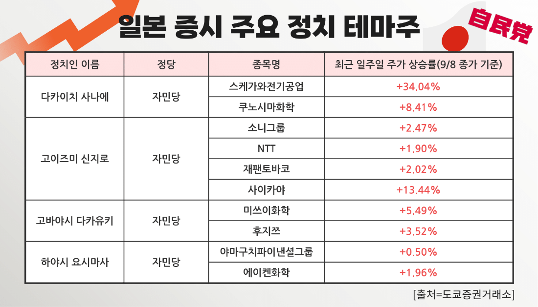 일본 이시바 총리의 사임 발표 이후 일본 증시가 요동치고 있다. 차기 총리 유력 후보와 관련 깊은 기업의 주식, 이른바 ‘정치 테마주’ 투자 열풍이 불고 있는 탓이다. 특정 정치인의 정책 방향이나 연고지를 바탕으로 관련 기업들이 주목받는 현상은 국내 투자자들에게도 익숙한 모습이다. 현재 가장 주목받는 정치 테마주로는 ‘다카이치 테마주’와 ‘고이즈미 테마주’ 등이 꼽힌다.
