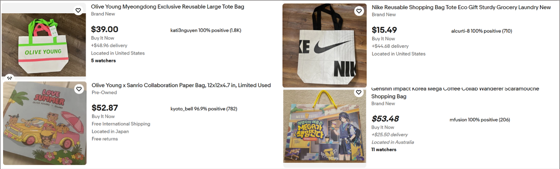 이러한 인기 덕분에 일부 상품들은 해외 중고 거래 사이트에서 원가보다 훨씬 높은 가격에 판매되기도 한다. 올리브영에서 3000원에 판매되는 리유저블 백은 미국 중고거래 사이트 이베이에서 39달러(약 5만4000원)에 거래되고 있다. 심지어 매장에서는 100원에 판매되는 기본 쇼핑백조차 최소 15달러(약 2만원)에서 최대 52.87달러(약 7만3200원)에 거래되고 있었다.