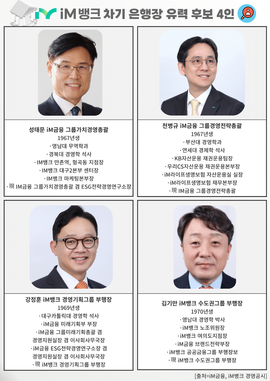 현재 차기 은행장 하마평에는 총 4명의 이름이 오르내리고 있다. 금융지주 핵심 임원 2명과 은행 핵심 임원 2명이다. 금융지주 출신으론 성태문 그룹가치경영총괄 부사장과 천병규 그룹경영전략총괄 부사장 등이 유력 후보로 언급되고 있다. 그동안 iM금융의 경영 전략을 주도해 온 경험을 바탕으로 그룹의 중장기 비전을 이어갈 수 있는 후보로 주목받고 있다. 성 부사장은 자본 건전성과 리스크 관리 부문에, 천 부사장은 영업 전략과 조직 운영 부문에 각각 강점을 지닌 것으로 평가받고 있다.