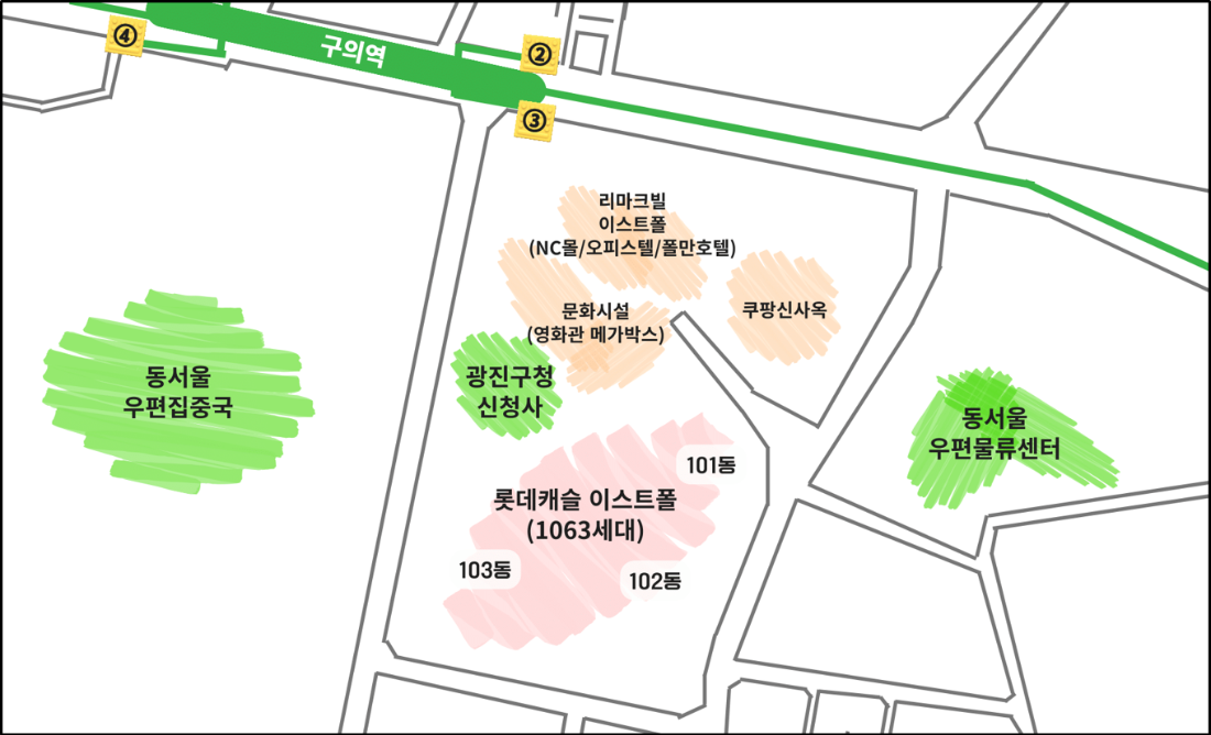 구의역 상권의 변화를 이끄는 중심에는 ‘롯데캐슬 이스트폴’이 있다. 이 단지는 과거 동부지방법원과 KT 부지를 포함한 7만8119㎡ 부지를 복합 개발한 ‘광진구 자양1재정비촉진구역 도시정비형 재개발 사업’을 통해 탄생했다. 지하 7층, 지상 48층, 총 6개 동 1,063세대 규모로 조성된 이스트폴에는 업무시설, 호텔, 오피스텔, 공동주택 등이 들어섰다.