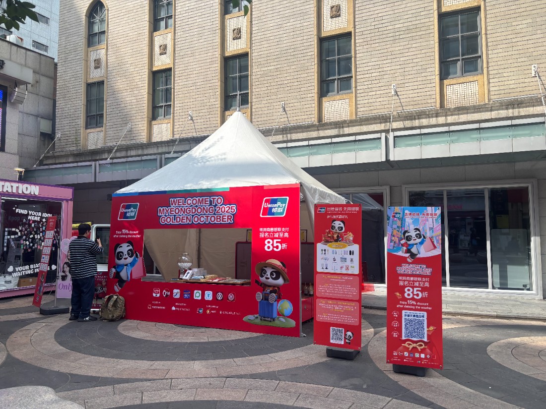 명동 거리 한쪽에는 소규모 행사장이 마련돼 중국인 관광객들의 발길을 끌었다. 유니온페이 결제 고객을 대상으로 한 프로모션도 진행됐다. 명동 내 상점에서 유니온페이로 결제한 뒤 행사장에서 영수증을 제시하면 휴대용 선풍기나 캐릭터 인형 ‘잔망루피’ 등 여행에 유용한 경품을 받을 수 있는 방식이다. 거리 곳곳에는 이를 알리는 중국어 플래카드가 내걸려 있다.