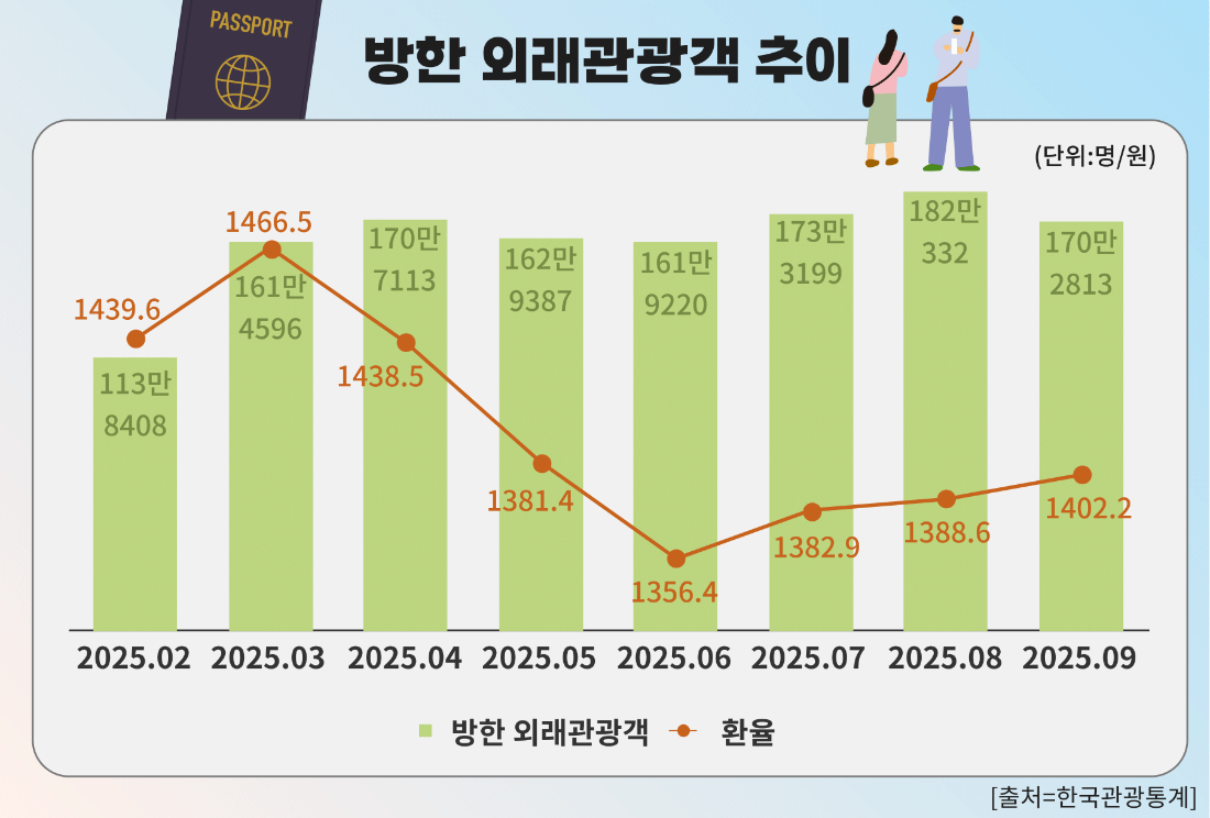 전문가들 역시 환율 흐름이 국내 소비와 외국인 관광 수요에 상반된 영향을 미치고 있다고 분석했다. 김대종 세종대 경제학과 교수는 “환율은 84% 확률로 우상향할 것으로 보인다”며 “앞으로 원·달러 환율은 1500원을 돌파할 가능성이 높고, 2026년에는 1600원까지 상승할 수 있다”고 밝혔다.