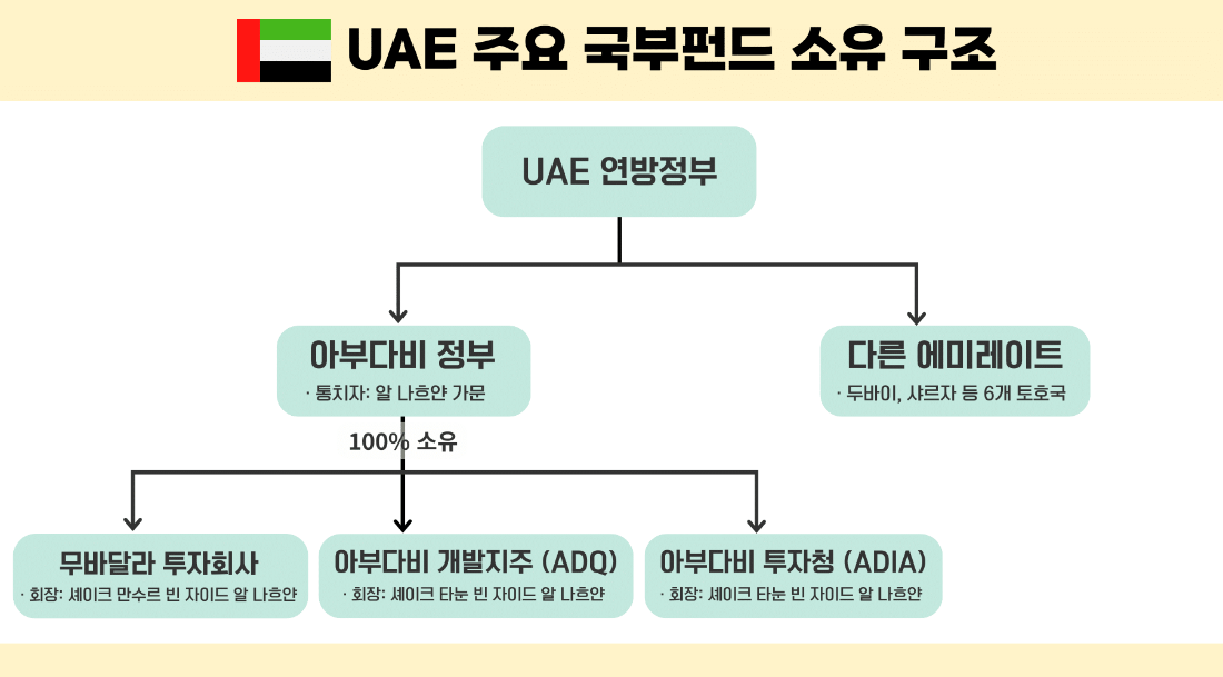 올해 상반기 기준 UAE의 투자자산’(SOI) 총액은 약 2조4900억달러(원화 약 3600조)에 달한다. 전 세계에서 미국, 중국에 이어 세 번째로 큰 규모다. UAE의 투자자산은 석유 수익을 기반으로 한 거대 국부펀드를 통해 운영된다. 주요 기관으로는 무바달라 투자회사(이하 무바달라), 아부다비투자청(ADIA), 아부다비개발지주(ADQ), UAE 국영기술투자회사(MGX) 등이 있다. 이들 기관의 고위직 역시 알 나흐얀 가문 구성원들이 맡고 있다. 사실상 알 나흐얀 가문이 투자를 결정하고 집행하는 모든 과정을 도맡고 있는 셈이다.