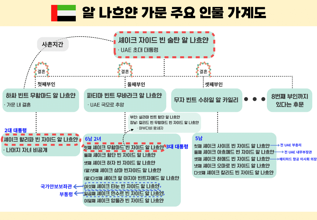 현지 언론에 따르면 세이크 자이드 빈 술탄 알 나흐얀 전 대통령은 8명의 부인 사이에서 30명이 넘는 자식을 둔 것으로 전해지지만 실제 부인과 자식의 정확한 수는 여전히 베일에 가려져 있다. 첫째 부인 ‘하싸 빈트 무함마드 알 나흐얀’, 둘째 부인 ‘파티마 빈트 무바라크 알 나흐얀’, 셋째 부인 ‘무자 빈트 수하일 알 카일리’ 등만 알려진 상태다. 이들 중 첫째 부인은 같은 알 나흐얀 가문 출신으로 혈통 유지를 위해 동성혼을 한 것으로 알려졌다. 대통령직은 첫째 부인과의 사이에서 태어난 장남인 ‘셰이크 할리파 빈 자이드 나흐얀’에게 물려줬다.