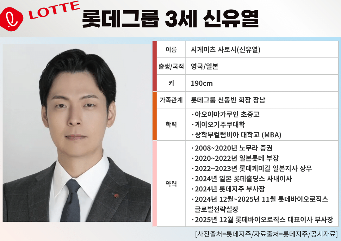 그룹 전반에는 칼바람이 불었지만 신유열 부사장의 행보는 결이 다르다. 이번 인사에서 신 부사장은 그간 초고속 승진을 해온 것과 달리 처음으로 직급이 유지되며 ‘숨 고르기’에 들어갔지만 역할과 무게는 오히려 더 커졌다. 롯데지주 미래성장실장을 유지한 데 더해 그룹의 미래 먹거리로 점찍은 롯데바이오로직스의 각자 대표이사로 공식 선임된 것이다. 전략컨트롤 조직에서도 중책을 맡으며 그룹 신사업과 포트폴리오 전환의 중심에 서게 됐다.