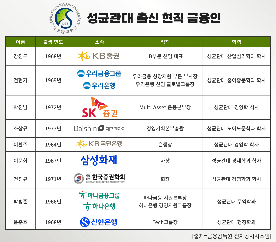 이 외에도 이문화 삼성화재 사장(1967년생·성균관대 경제학과), 전진규 한국증권학회 회장(1971년생·성균관대 경영학과), 박병준 하나금융 지원본부장 겸 하나은행 경영지원그룹장(1966년생·성균관대 무역학과), 윤준호 신한은행 Tech그룹 부행장(1968년생·성균관대 행정학과) 등 주요 금융사 임원 다수가 성균관대 졸업생이다.