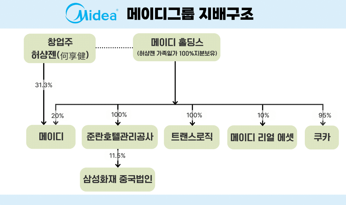 삼성재산보험 지분을 인수한 준란호텔관리유한공사는 메이디홀딩스의 호텔 부문 자회사다. 메이디홀딩스는 창업주 허샹젠(何享健)과 그의 가족들이 100% 지분을 보유한 회사로 그룹 지배구조의 정점에 자리하고 있다. 다만 가족 구성원별 구체적인 지분율은 베일에 가려져 있다. 메이디홀딩스의 주요 자회사로는 ▲메이디(가전 제조·판매사) ▲준란호텔관리유한공사(호텔 운영·관리 법인) ▲트랜스로직(물류 자동화 솔루션 자회사) ▲메이디 리얼에셋(부동산 개발) ▲쿠카(로봇 제조사) 등이 있다.