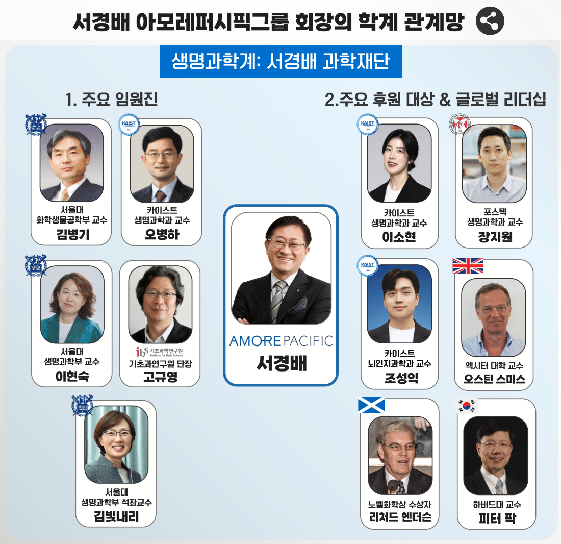 서 회장은 자신의 이름을 딴 재단에 남다른 애정을 보이며 다양한 공익사업을 전개해왔는데 그 과정에서 인적 네트워크가 만들어지기도 했다. 일례로 서경배과학재단은 매년 도전적인 연구를 시도하는 신진 과학자들을 공개 선발해 연간 최대 5억원의 연구비를 5년간 지원하는 프로그램을 전개하고 있다. 올해까지 재단이 지원한 신진 과학자는 31명으로 연구비 지원액은 총 860억원에 달한다. 지원을 받은 인물 중에는 소뇌 발달에 관한 논문을 작성한 이소현 카이스트 생명과학과 교수, 배아 조직 연구를 진행 중인 장지원 포스텍 생명과학과 교수, 다질환 치료법 개발을 전담하고 있는 조성익 카이스트 뇌인지과학과 교수 등이 있다.