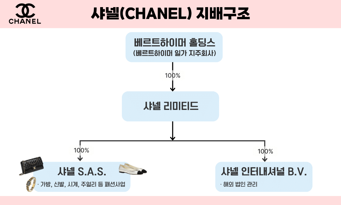 샤넬 리미티드는 프랑스 현지 법인 ‘샤넬 S.A.S.’와 해외 투자 법인 ‘샤넬 인터내셔널 B.V.’를 각각 100% 자회사로 두고 있다. 샤넬 S.A.S.는 의류, 가방, 신발, 시계, 주얼리 등 패션 사업을 담당하는 동시에 장인 기술을 보호하기 위한 공방들을 관리하는 역할을 맡고 있다. 샤넬 인터내셔널 B.V.는 아시아·미주·유럽 등 해외 법인을 관리하며 샤넬의 국제 사업 운영을 책임지고 있다.