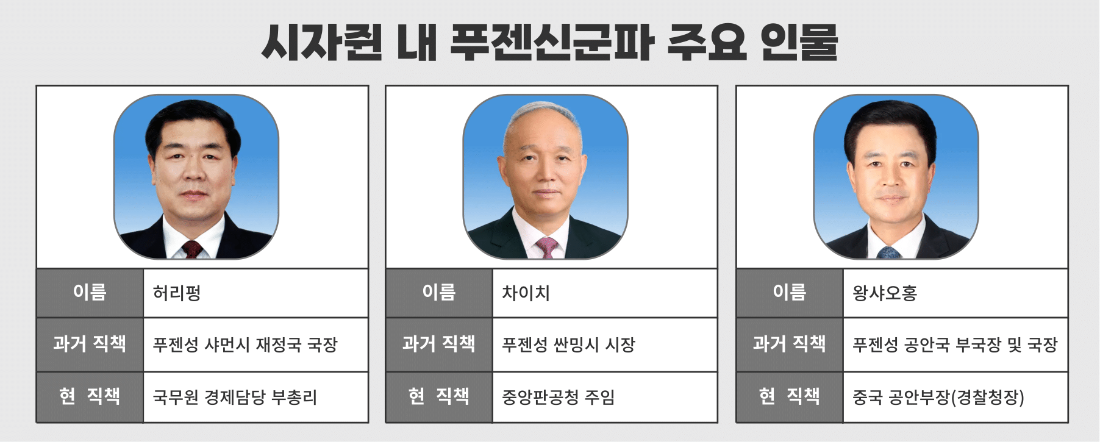 시자쥔을 구성하는 또 다른 세력으론 ‘푸젠신군’(福建新軍)이 있다. 푸젠신군은 시 주석의 푸젠성 근무 시절 함께 일하며 인연을 맺었던 정치인 및 관료 그룹을 일컫는 단어다. 시 주석은 과거 푸젠성의 닝더, 푸저우 등의 도시에서 약 17년 간 근무했다. 덕분에 푸젠성은 시 주석 정치 인생의 밑바탕을 닦은 지역으로 평가된다. 푸젠신군의 대표적인 인물로는 ▲허리펑(何立峰) 국무원 경제담당 부총리 ▲차이치(蔡奇) 중앙판공청 주임 ▲왕샤오홍(王小洪) 중국 공안부장(경찰청장) 등이 꼽힌다.