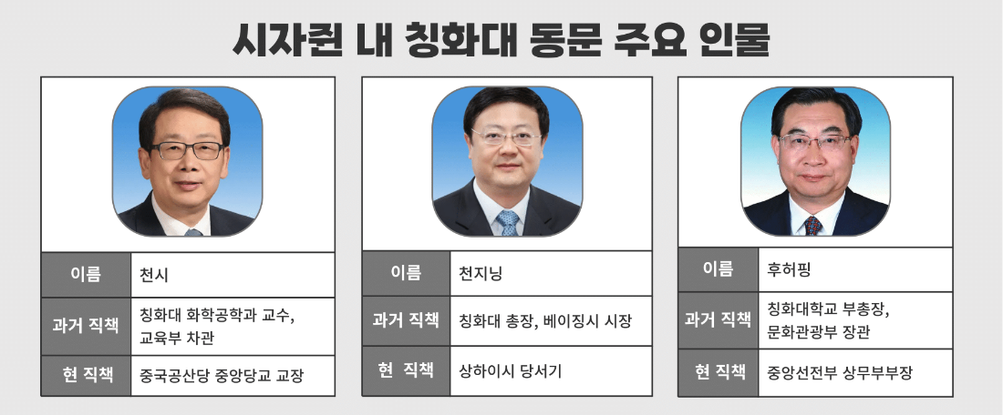 이 밖에도 시 주석의 칭화대 동문 집단을 구성하는 인물로는 ▲천지닝(陳吉寧) 상하이시 당서기 ▲후허핑(胡和平) 중앙선전부 상무부부장 등이 있다. 천지닝 당서기는 칭화대 토목환경공학과를 전공한 뒤 칭화대에서 교수, 학과장, 부총장, 총장 등을 역임한 칭화대 출신 학계 인사다. 천지닝 당서기는 2018년 베이징 시장을 맡으며 베이징 동계 올림픽 조직위원회를 직접 지휘하기도 했다. 현재 그가 맡고 있는 상하이시 당서기직은 중국 내 정치권 요직으로 향하는 핵심 요직으로 평가되는 자리다. 시 주석과 리창 총리 모두 과거 상하이 당서기장을 역임했다.