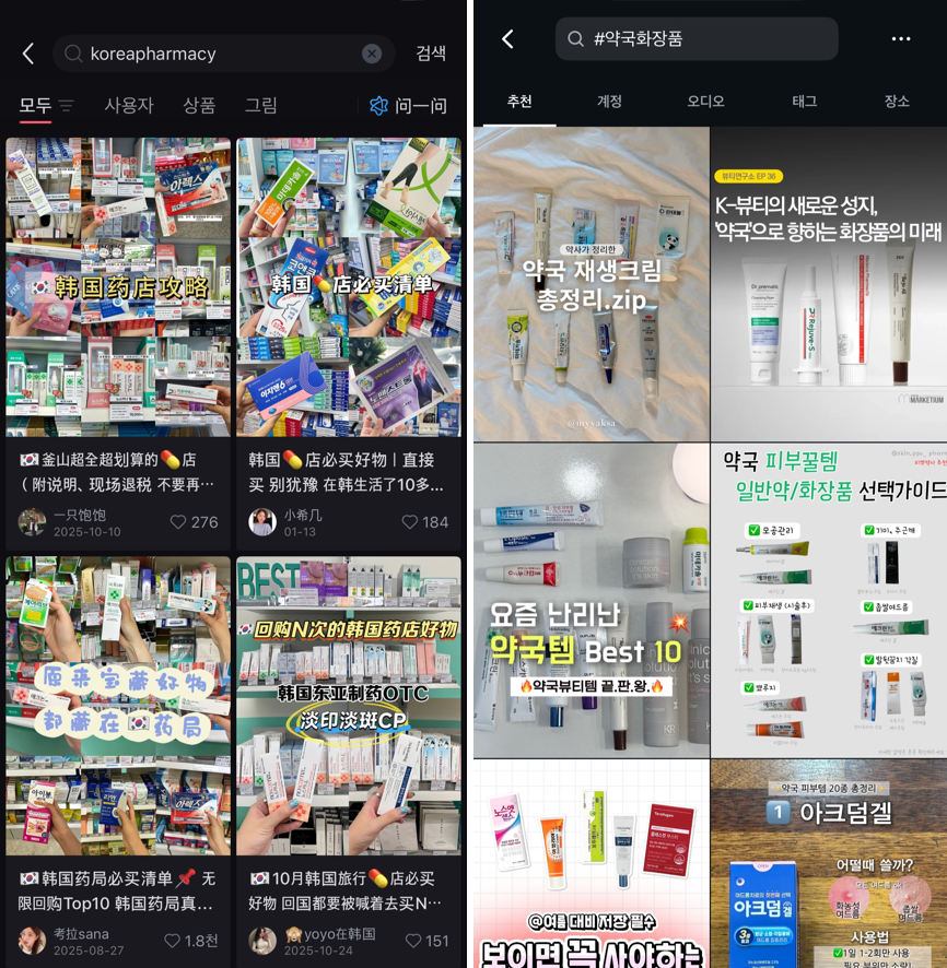 인스타그램에서 ‘#koreanpharmacy(한국 약국)’ 해시태그는 1000건 이상, ‘#약국화장품’은 2만건 이상 등록되어 있으며, 유튜브와 샤오홍슈에서는 ‘Korean Pharmacy Must Buy(한국에서 꼭 사야 할 약국템)’라는 제목의 추천 영상이 조회수 3만 회 이상을 기록하는 경우가 많다. 게시글을 본 누리꾼들은 “한국 약국 제품은 가격이 저렴하다”, “한국에서 피부과 시술 후 관리용으로 좋다”며 호평을 남겼다. 일부는 한 번에 여러 제품을 구매한 사진을 올리며 ‘약국 쇼핑’을 인증하기도 했다.