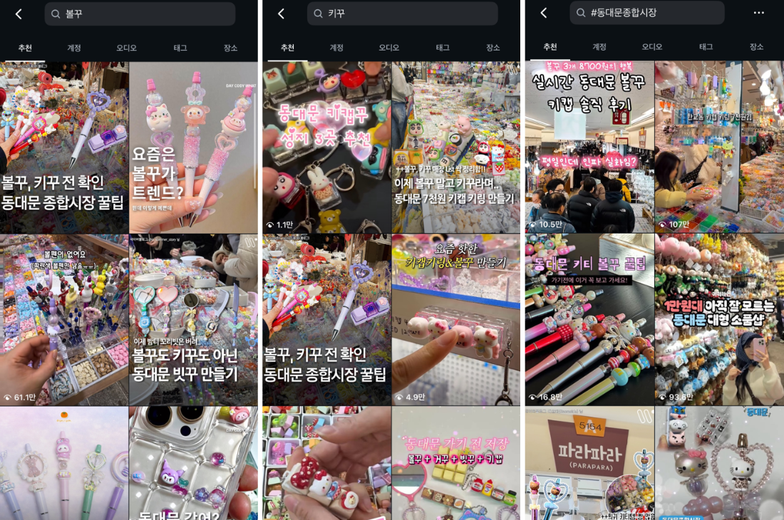 ‘볼꾸’와 ‘키꾸’는 지난해 말부터 인스타그램 등 SNS를 중심으로 빠르게 확산된 DIY 트렌드다. 몇 년 전 유행했던 키링을 활용한 가방 꾸미기의 연장선에서 등장한 새로운 꾸미기 문화로 평가된다. 인스타그램에서 ‘#볼꾸’와 ‘#키꾸’ 해시태그는 각각 1000건 이상의 게시물이 등록돼 있으며, ‘#동대문종합시장’ 해시태그는 12만4000여 건에 달한다. 게시물에는 관련 부자재를 판매하는 매장 정보부터 자신이 직접 꾸민 볼펜과 키캡을 자랑하는 사진까지 다양하게 올라와 있다.