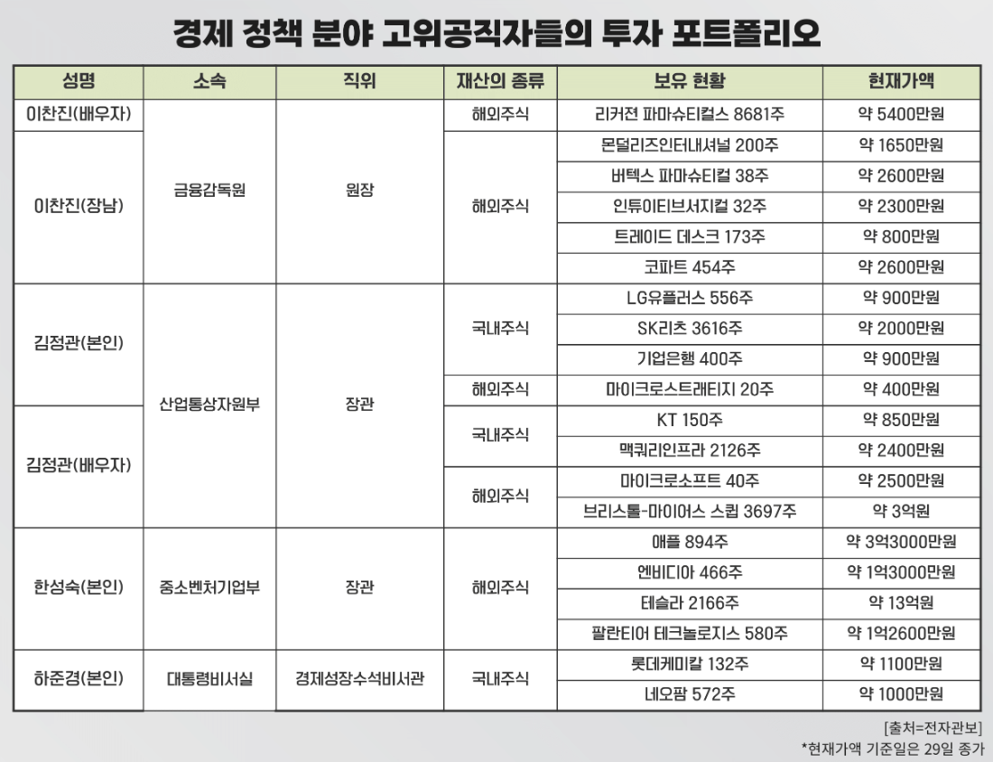 전문가들은 국가 경제 정책을 설계할 정도의 능력과 경험을 지닌 고위 공직자들의 투자 종목은 개인 투자자들에겐 상당히 유익한 정보가 될 수 있다고 강조했다. 김계수 세명대 경영학과 교수는 “고위 공직자들의 투자 포트폴리오는 단순한 개인 차원의 재테크를 넘어 정책 설계자들이 바라보는 미래 산업의 가늠자가 될 수 있다”며 “정보에 취약한 개인 투자자들에게 시장의 흐름을 읽는 일종의 ‘투자 바이블’로 활용될 여지도 충분해 보인다”고 말했다.