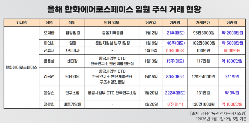 5일 금융감독원에 따르면 올해 주식 거래를 진행한 한화에어로스페이스 임원 7명 중 5명이 보유 주식을 대거 처분했다. 매도 규모는 적게는 수천만원에서 많게는 수억원대에 달했다. 일례로 오계환 중동지역총괄 임원은 지난달 2일 보유 중이던 한화에어로스페이스 주식 21주 전량을 장내 매도했다. 매도가는 약 2000만원 가량이었다. 같은달 8일 이인희 준법지원실 법무1팀장 역시 48주를 주당가 102만3000원, 총 5000만원 가량에 매도했다.