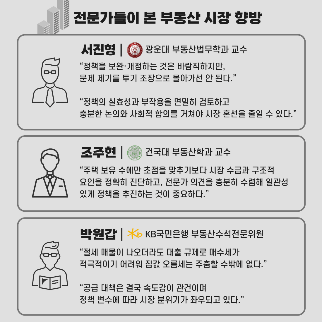서진형 광운대 부동산법무학과 교수는 “부동산 정책을 발표한 이후 국민 의견을 반영해 보완·개정하는 것은 바람직한 과정이라 본다”며 “다만 정책의 문제점을 지적하는 목소리를 투기 조장으로 몰아가는 것은 적절하지 않다”고 지적했다. 이어 “정책의 실효성과 부작용을 면밀히 검토하기 위해서는 다양한 전문가 의견을 폭넓게 수렴하는 절차가 필요하다”며 “충분한 논의와 사회적 합의를 거쳐 정책을 수립해야 시장의 혼선을 줄일 수 있다”고 강조했다.