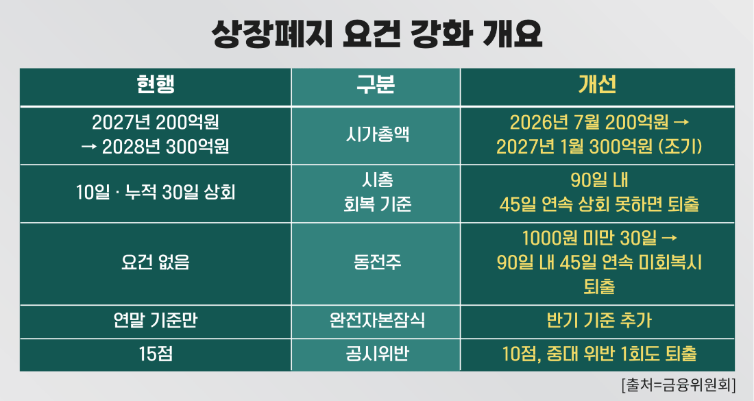 최근 금융위원회와 한국거래소는 부실기업을 신속히 퇴출하기 위한 상장폐지 제도 개편을 발표했다. 시가총액 기준 상향, 동전주 퇴출 기준 신설, 상장폐지 심사 절차 단축 등이 핵심이다. 특히 주가 1000원 미만 종목이 일정 기간 지속될 경우 상장폐지 대상에 포함되도록 제도를 강화하면서 저가 종목 투자 위험이 크게 높아졌다는 분석이 나온다.