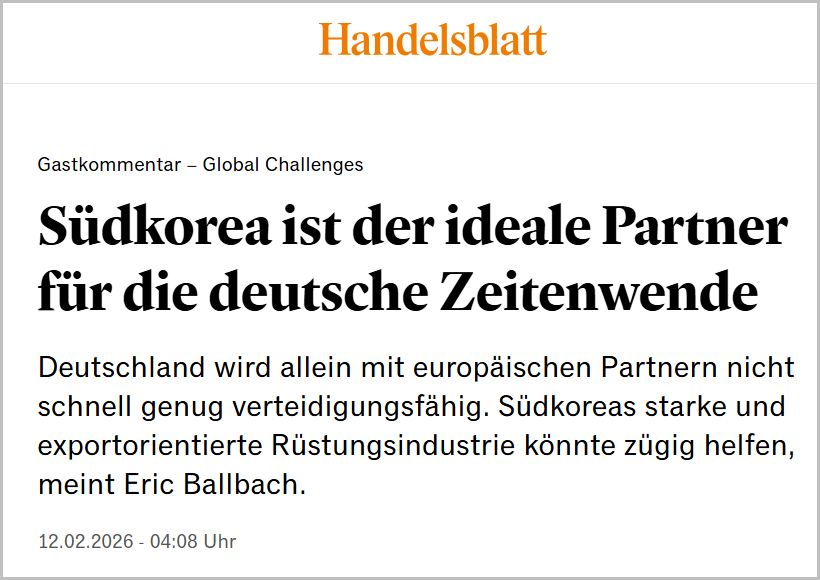 12일(현지시간) 방산업계 등에 따르면 이날 독일 유력 경제 일간지 한델스블라트(Handelsblatt)는 ‘한국은 독일의 시대 전환에 있어 이상적인 파트너’라는 제목의 기사를 통해 한국의 강력하고 수출 지향적인 방위산업 역량을 집중 조명했다. 해당 기사에는 한국이 지정학적 위기 속에서 단기간에 대규모 무기 체계를 공급할 수 있는 세계에서 몇 안 되는 국가라는 점을 강조하는 내용이 담겼다.
