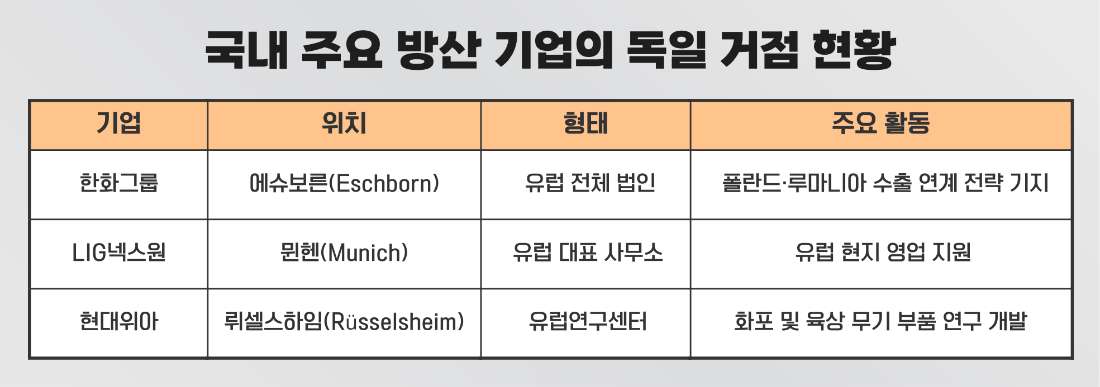 국내 주요 방산 기업들은 이미 독일에 탄탄한 컨트롤타워를 구축해 놓은 상태다. 한화그룹은 독일 에슈보른에 한화 유럽법인을 설립해 방산 분야 자회사인 한화에어로스페이스의 유럽 내 영업을 지원하고 있다. 최근 한화에어로스페이스가 폴란드와 루마니아 등 동유럽과의 대규모 방산 계약을 연이어 수주하면서 독일 에슈보른 법인의 전략적 중요성은 더욱 커진 상황이다.