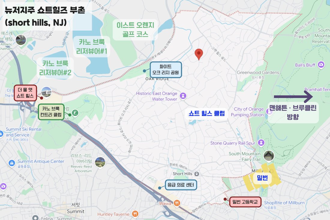 뉴저지주 쇼트힐즈(Short Hills)는 미국 내에서 ‘가장 부유한 타운’ 순위에 항상 최상위권으로 거론되는 지역이다. 특히 포브스 400대 부자 명단에 포함되는 헤지펀드 매니저들이 다수 거주해 ‘월스트리트의 침실’이라는 별명까지 얻었다. 뉴욕 맨해튼과 가까우면서도 공원과 녹지가 풍부해 전원형 주거 환경을 갖춘 덕분에 뉴욕으로 출퇴근하는 기업 임원·의사·변호사 등 고소득 전문직 종사자와 상류층 가문들이 선호하는 동부 대표 부촌으로 자리 잡았다.