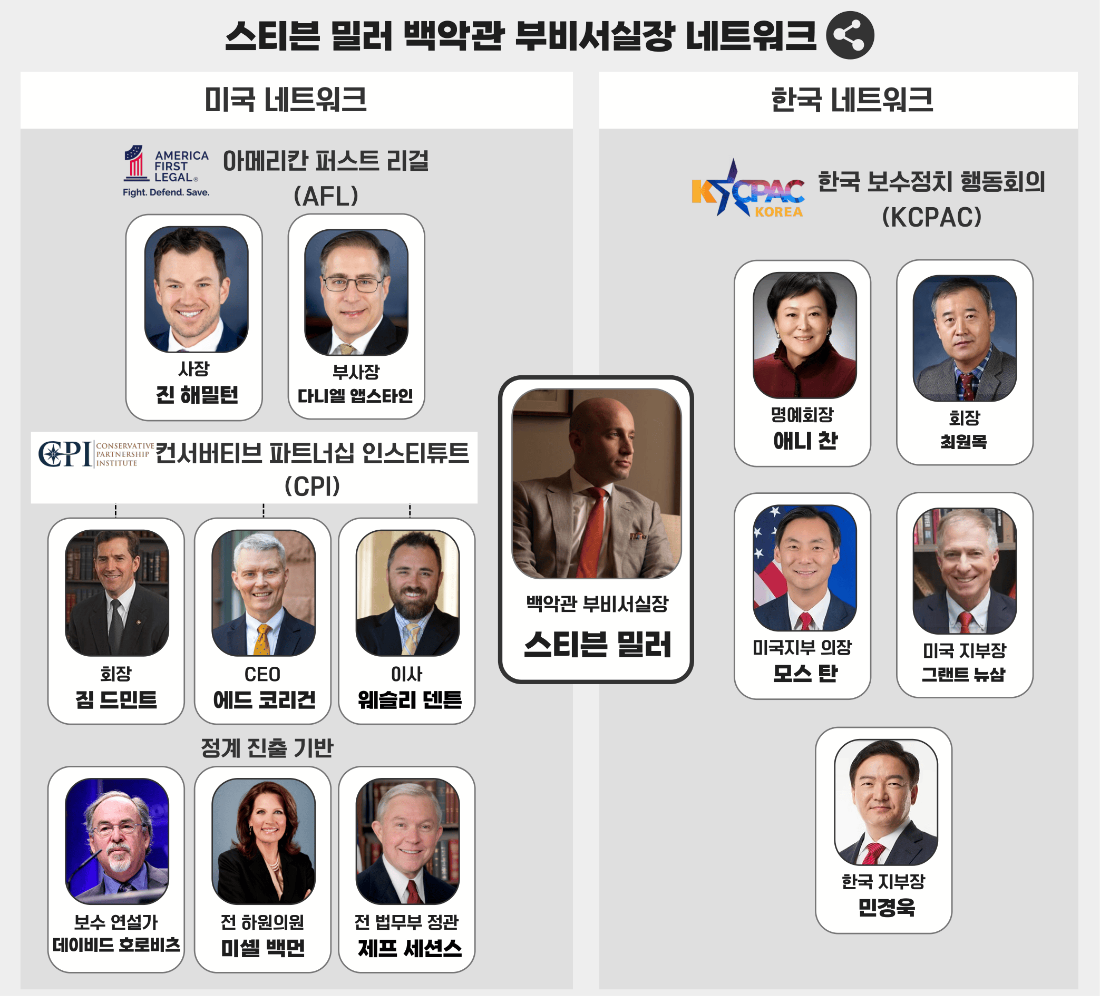 밀러 부비서실장의 인적 네트워크에는 한국인들도 다수 포함돼 있다. 미국 내 한인 보수 연합체인 KCPAC(한국보수정치행동회의)가 대표적이다. 밀러 부비서실장은 미국 보수 단체 ‘보수정치행동회의(CPAC)’가 주최하는 행사에 꾸준히 참석하고 있는데 KCPAC 역시 지난 2019년부터 지난해까지 매년 CPAC 국제 파트너 자격으로 행사 주최에 힘을 보태고 있다. 또 밀러 부비서실장은 진보 진영의 정체성 정치와 DEI(다양성·형평성·포용성) 정책이 미국 사회를 망치고 있다고 주장하고 있는데 KCPAC는 그의 목소리를 한국계 커뮤니티에 전파하는 스피커 역할을 맡고 있고 있다. KCPAC을 포함한 한인 보수 단체들은 “법을 지키는 합법 이민자가 존중받아야 한다”며 강경 이민 정책에도 힘을 보태고 있다.