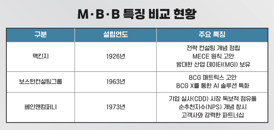 세계 3대 전략 컨설팅사인 맥킨지(McKinsey), 보스턴컨설팅그룹(BCG), 베인앤컴퍼니(Bain & Company) 등은 사고력과 사업적 통찰력을 바탕으로 기업 전략 수립, 인수합병(M&A) 등의 업무를 주력으로 한다. 이곳 출신들은 컨설팅 현장을 떠난 뒤에도 기업 CEO, 대기업 임원, 스타트업 창업, 사모펀드(PE) 및 벤처캐피털(VC) 등 다양한 분야에서 핵심 인재로 인정받고 있다. 미국 컨설팅 전문 언론 매체들의 분석에 따르면 포춘 500대 기업 고위 임원 중 MBB 출신 비중은 40%대에 육박한다.