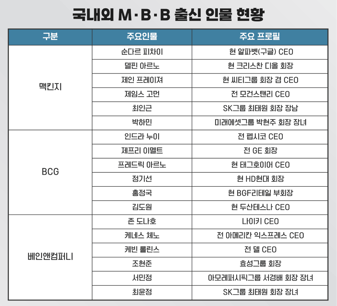 글로벌 경영 현장에서 전략 컨설팅사 출신들의 영향력이 갈수록 커지고 있다. 분야가 전혀 다르더라도 같은 글로벌 기업 규모라면 전략 컨설팅사 CEO 영입을 자연스럽게 여기는 분위기다. 다수의 전략 컨설팅사 중 CEO 배출 측면에서 가장 두각을 나타내는 곳은 맥킨지, BCG, 베인앤컴퍼니 등 이른바 ‘MBB’가 꼽힌다. 국내 재계에서도 SK그룹와 아모레퍼시픽그룹 등 주요 기업 후계자들이 경영 일선에 나서기 전 MBB를 거치는 것이 이미 ‘필수 경영 코스’로 자리매김했을 정도다.