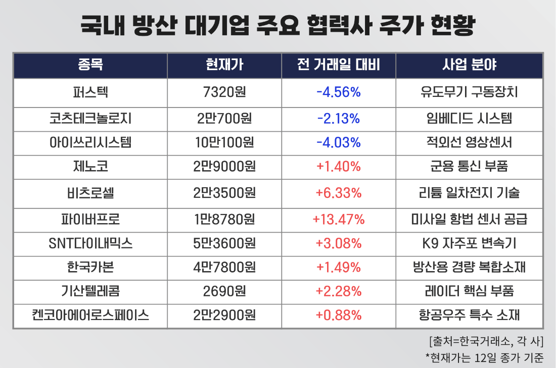 위성통신 및 군용 통신 부품 전문기업인 제노코와 미사일과 어뢰의 전원 공급원인 리튬 일차전지 분야 기술을 보유한 비츠로셀 역시 방산 대기업들의 대표적인 협력사로 꼽힌다. 이 밖에 ▲파이버프로(미사일 항법 센서 공급) ▲퍼스텍(유도탄 비행 제어) ▲SNT다이내믹스(K9 자주포 변속기) ▲한국카본(방산용 경량 복합소재) ▲기산텔레콤(레이더 핵심 부품) ▲캔코아에어로스페이스(항공우주 특수 소재) 등도 ‘K-방산’ 특수 가능성이 점쳐지는 기업들이다.