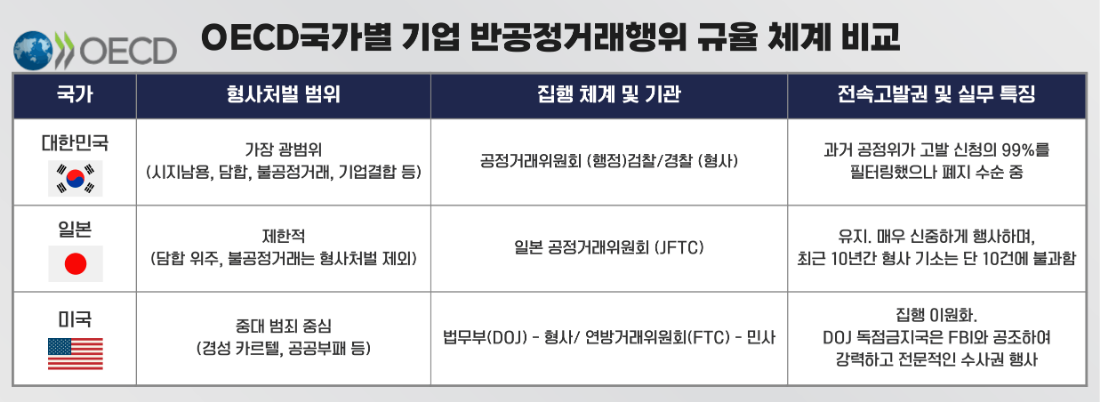 한국의 기업 규제 강도가 다른 OECD 국가들에 비해 이미 높다는 사실은 전속고발권 폐지 우려를 부채질하고 있다. OECD 회원국 중 기업의 거래행위 관련 형사제재를 규정한 국가는 13곳에 불과하다. 이 중에서도 한국은 유독 많은 형벌 규정을 두고 있다. 구체적으로 ▲시장지배적 지위 남용 ▲기업결합 ▲부당공동행위 ▲불공정거래행위 ▲사업자 단체 금지행위에는 3년 이하 징역 또는 2억 원 이하의 벌금을 부과한다. 또 ▲재판매가격 유지행위 ▲상호출자에는 2년 이하의 징역 또는 1억 5000만원 이하의 벌금에 처한다.