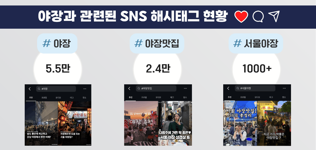 인스타그램에서 ‘#야장’을 검색하면 약 5만5000건이 넘는 게시물이 노출된다. ‘#야장맛집’은 2만4000건 이상, ‘#서울야장’ 해시태그는 약 1000개 이상의 게시물이 등록돼 있다. 게시물에는 살펴보면 골목에 놓인 간이 테이블과 의자, 노란 조명 아래에서 술잔을 기울이는 모습을 사진과 영상으로 공유하며 지금 이 시기에만 즐길 수 있는 ‘야장’을 소비하고 있었다.