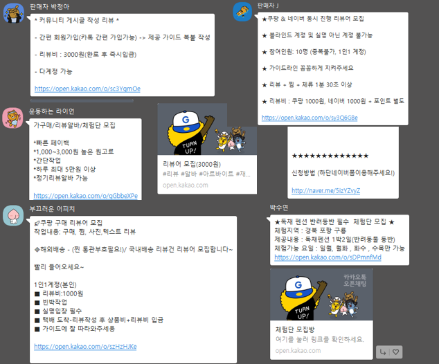 "★쿠팡 & 네이버 동시 진행, 리뷰 + 찜 + 체류 1분 30초 이상, 리뷰비 1000원 이상" 카카오톡 오픈 채팅방에 올라오는 알바 모집글이다. 검색창에 '리뷰' 혹은 '댓글 알바'를 치면 수백에서 수천 명이 들어가 있는 바이럴 마케팅 방 수십 개가 나온다.