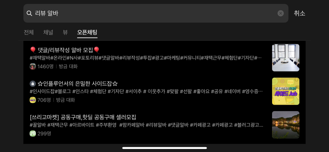 소비자 리뷰 알바를 위해 카카오톡 오픈 채팅방에 '바이럴 마케팅'과 '리뷰 알바'를 검색해 본 결과, 수백 명에서 많게는 수천 명까지 사람들이 모여있는 알바방 수십 개를 쉽게 찾을 수 있었다. 방에 입장하니 알바를 구하는 업체와 알바를 구인하는 아르바이트생들이 수백 명 모여있었다.