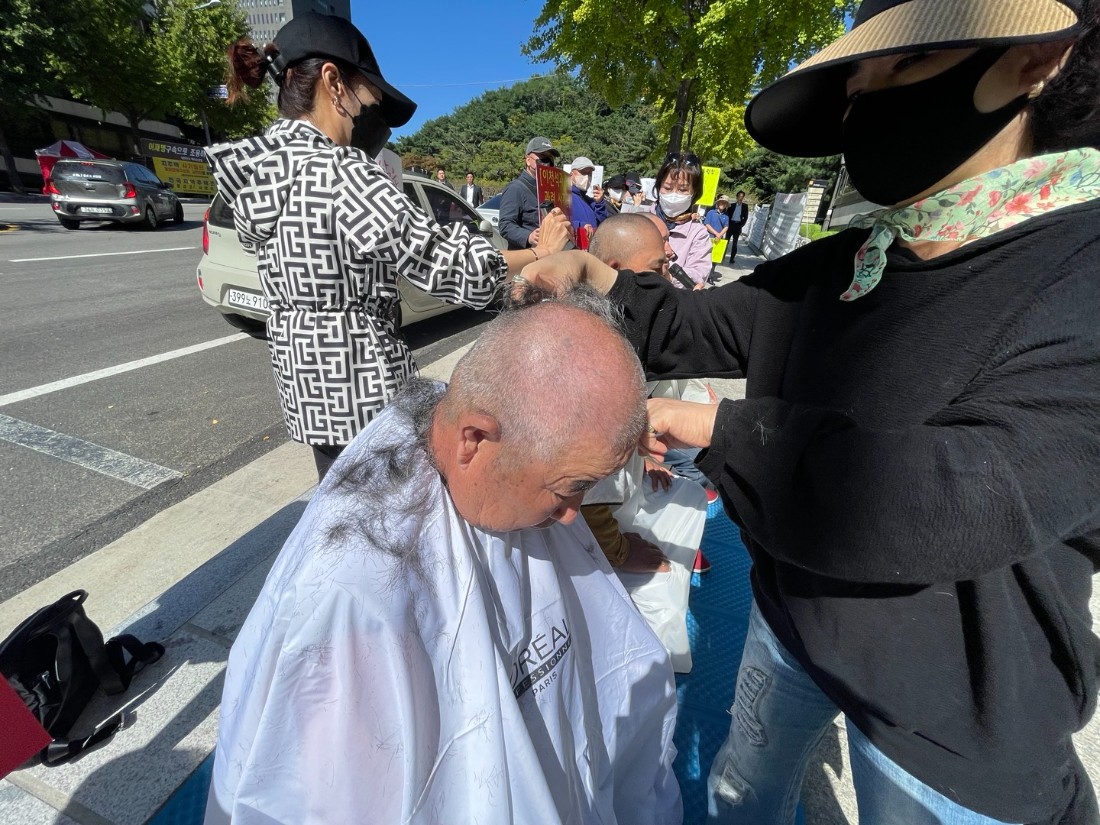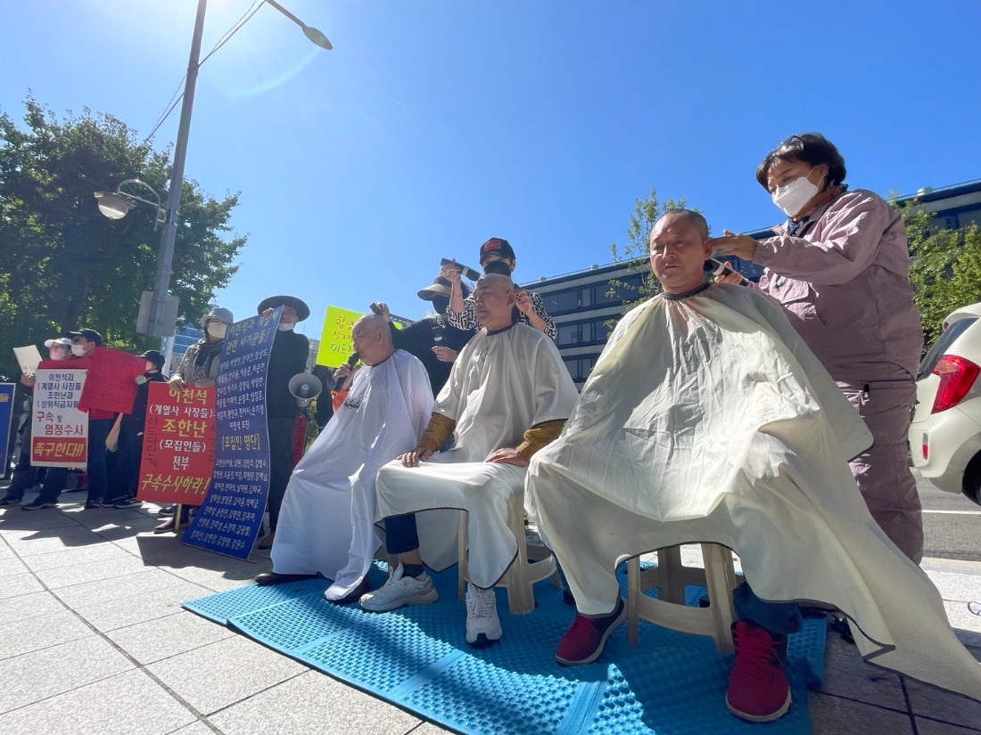 아도페이 피해자들이 삭발식을 진행하며 가해자들의 철저한 수사와 원금 회복을 호소했다.