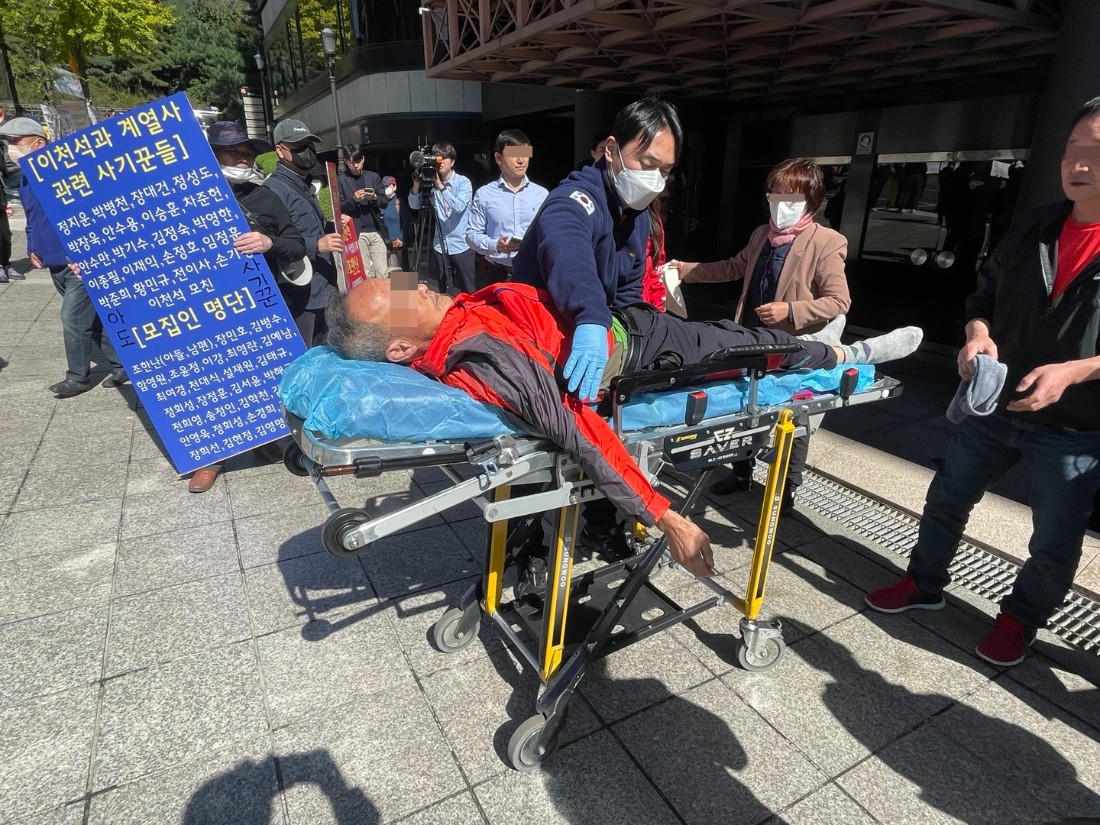쓰러진 피해자는 시위 참가자 중 최고령에 속하는 이순석(75·가명) 씨로 피해자 단체에 따르면 이 씨는 나이뿐만 아니라 피해 금액 또한 최고 수준인 1억4000만원이다. 이 씨는 아도페이로 노후자금이 모두 사라진 것은 물론 빚까지 생겨 집이 경매로 넘어갈 위기다. 또 아내와는 황혼이혼 직전까지 몰린 것으로 확인됐다.